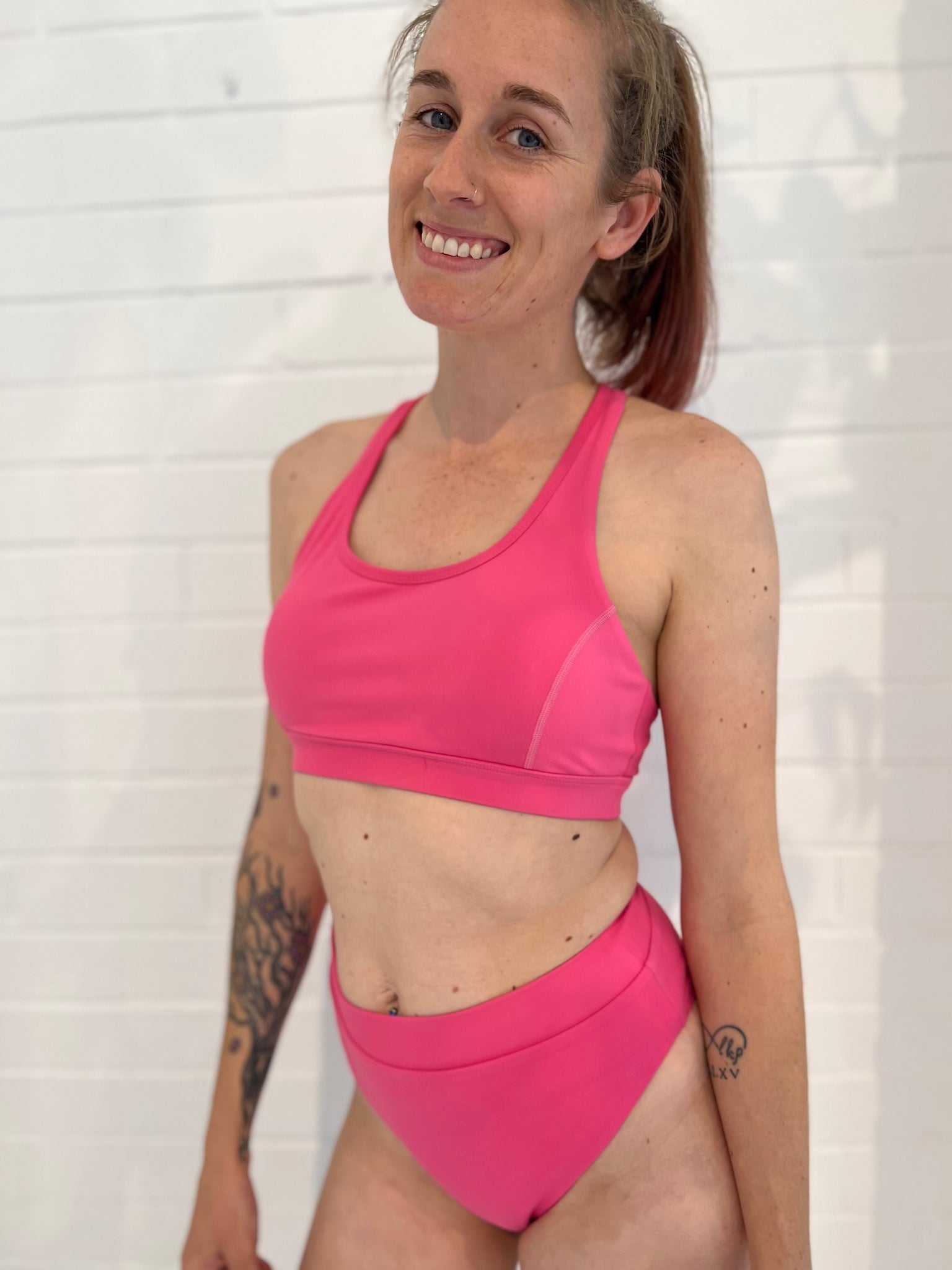 Lisa (with blonde hair held up wearing the matching set is wearing a Small. As is Kristy (with both arms out and down and short brown hair.) For Kristy she is boarderline on Small and Medium so can fit both depending on the day/time of month.)